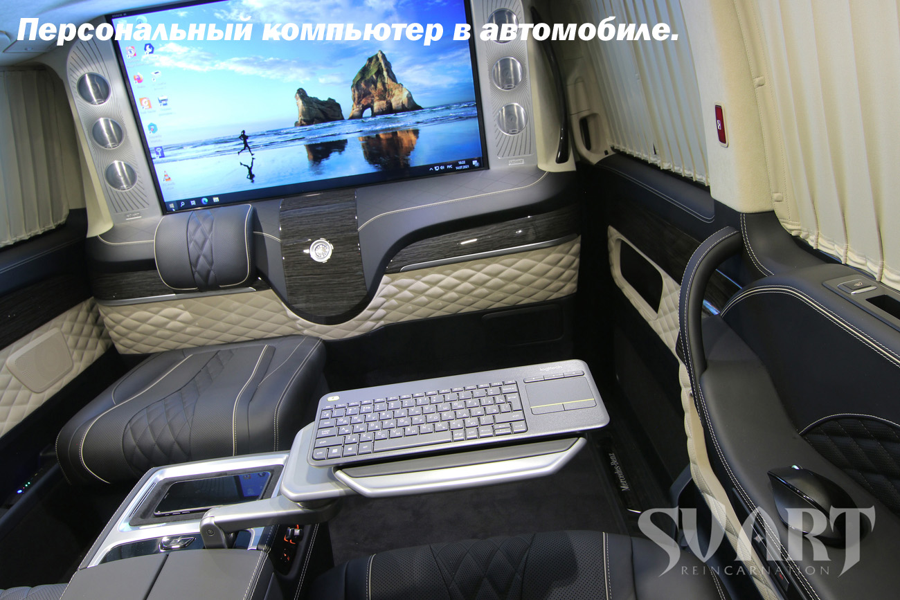 - Мониторы в спинку сидений (с креплением Plug&Play в стиле Mercedes-Benz). Речь идет о стильных и современных мониторах, выполненных в лучших традициях дизайнеров концерна Mercedes-Benz. Для интеграции таких мониторов дорабатывается спинка сидений и монтируется система специальных разъемов Plug&Play, к которым подводится питание. Функциональность, дизайн и простота эксплуатации данных компонентов мультимедийной системы салона позволят организовать для задних пассажиров настоящий центр развлечений в пределах отведенного пространства в салоне.