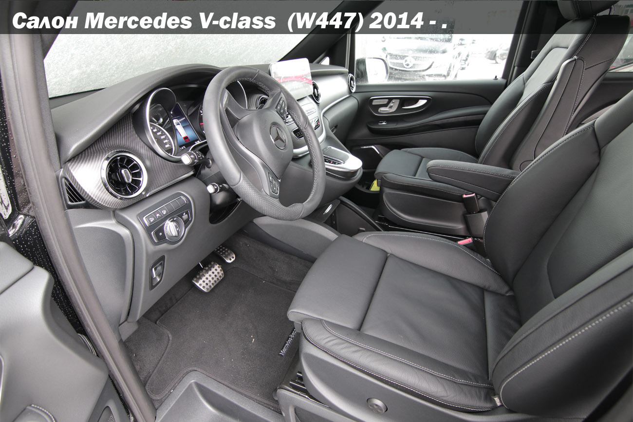 - Дизайн интерьера Mercedes-Benz V-Class. Великолепно спроектированный интерьер является образцовым для пассажирских транспортных средств с точки зрения эргономики, а также визуального и тактильного качества. Элементы отделки с эффектом рояльного лака черного глянцевого цвета подчеркивают высококачественную атмосферу интерьера. Их широкое использование, например, на приборной панели, усиливает это впечатление. Из особенностей интерьера обновленного минивэна стоит выделить эксклюзивные воздуховоды, выполненные в классическом стиле авиационных турбин, обновленные шкалы комбинации приборов, а также новую обивку из кожи Tarufo Nappa. Инструментальные элементы центральной приборной панели стали еще удобней и лаконичней. Окружающее освещение остается неизменным с тремя оттенками и пятью уровнями яркости. Из опций для интерьера V-Класса доступны всевозможные вставки – из дерева, имитации карбона, алюминия и пластика в стиле «рояльный лак». Присутствует и достаточный набор средств для связи и коммуникации. Модуль LTE доступен в качестве стандартного оборудования. За комфорт VIP-пассажиров отвечают мультимедийная система с сенсорным экраном и навигацией, аудиосистема высокого качества, климат-контроль на всех рядах сидений, подогрев и вентиляция некоторых из них и панорамная крыша.